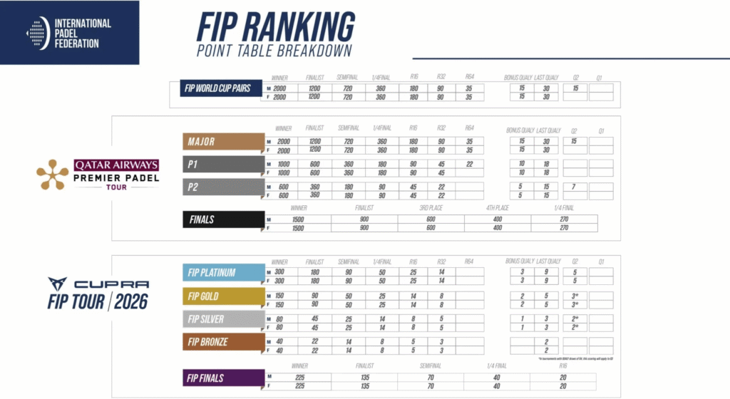 Ranking FIP opiera się na tzw. systemie „defence points”, czyli mechanizmie obrony punktów. Oznacza to, że po upływie 52 tygodni punkty zdobyte w danym turnieju — zarówno w cyklu Premier Padel, jak i w rozgrywkach CUPRA FIP Tour — są odejmowane od dorobku zawodnika. Aby utrzymać swoją pozycję w rankingu, gracz musi w kolejnym turnieju co najmniej powtórzyć wcześniejszy wynik lub zdobyć większą liczbę punktów w analogicznym okresie.